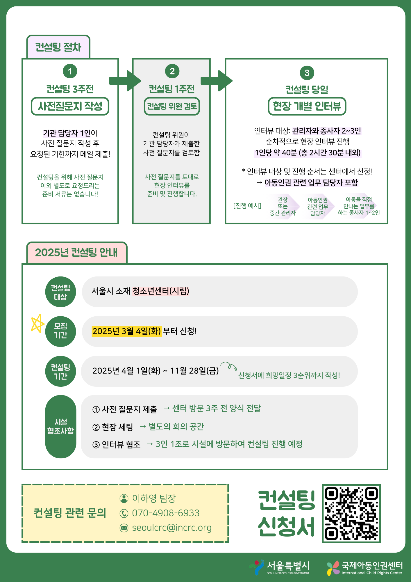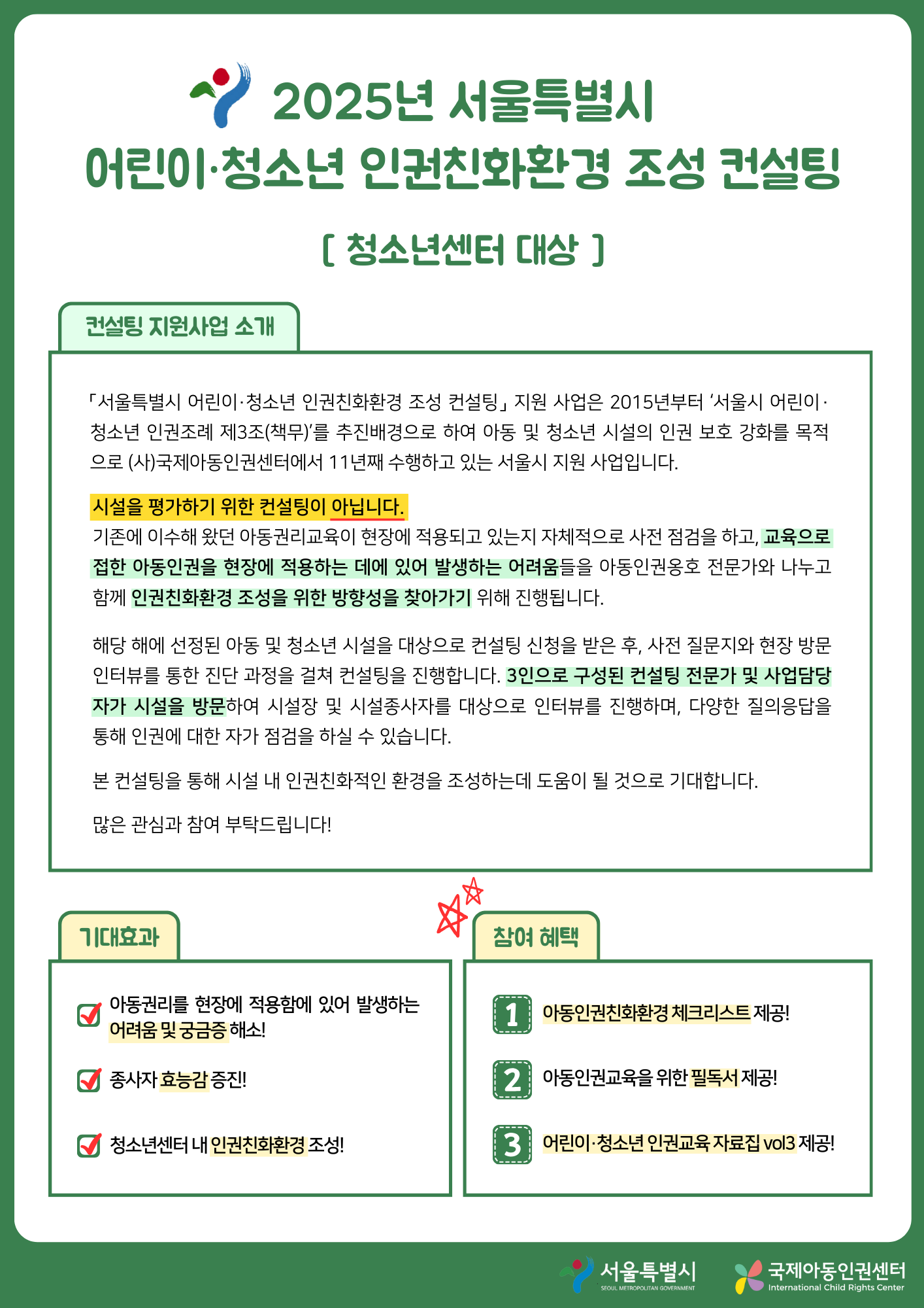 2025년 청소년센터를 대상으로 어린이·청소년 인권친화환경 조성 컨설팅 지원 사업이 진행됩니다.